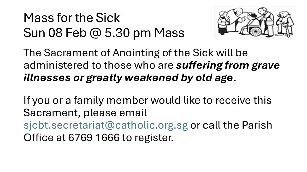 If you or a family member would like to receive this Sacrament, please email sjcbt.secretariat@catholic.org.sg or call the Parish Office at 6769 1666 to register.