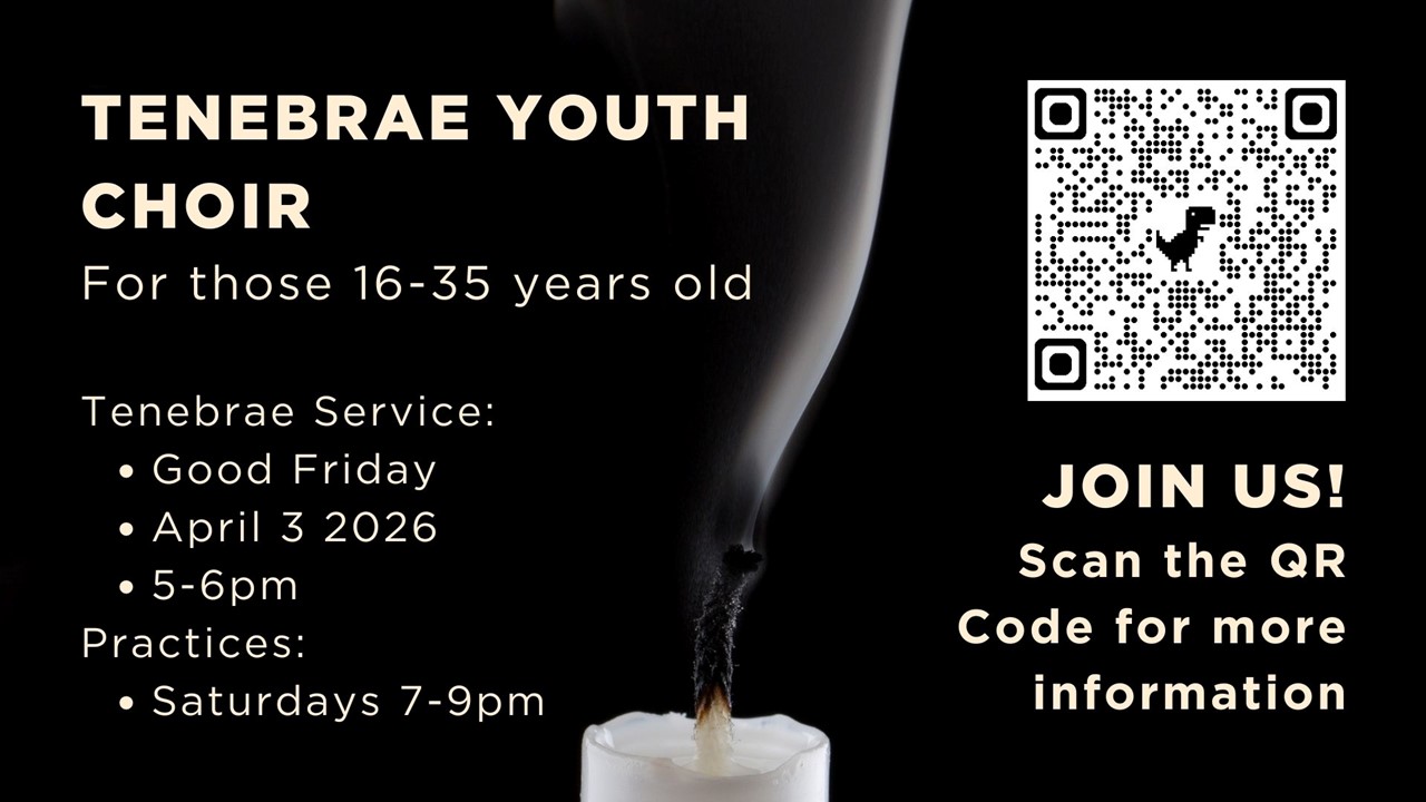 The Tenebrae Youth Choir is looking for male and female singers 16-35 years old for the Tenebrae Service on Good Friday. Offer your voice to our Lord and register at: https://tinyurl.com/Tenebrae2026