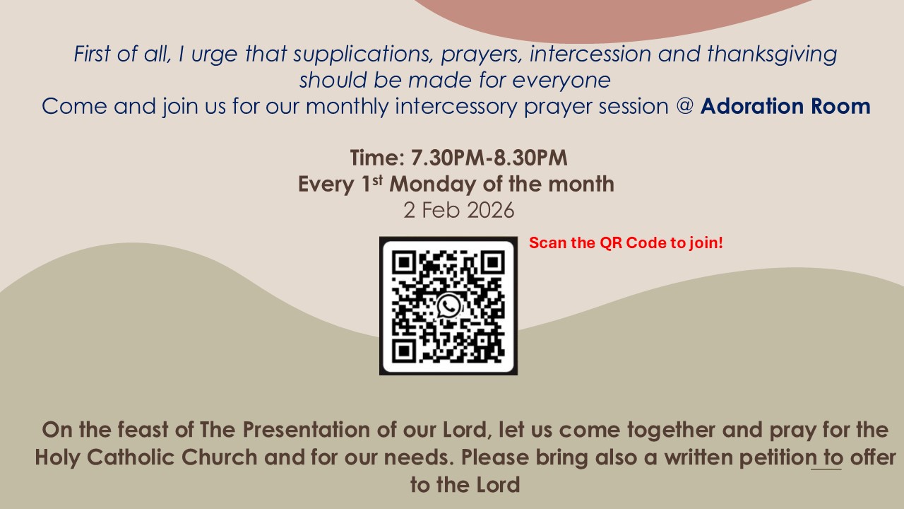 Intercessory Prayers are now held on the 1st Mondays of the month and at a new timing of 7.30 pm. Do bring along your rosaries.