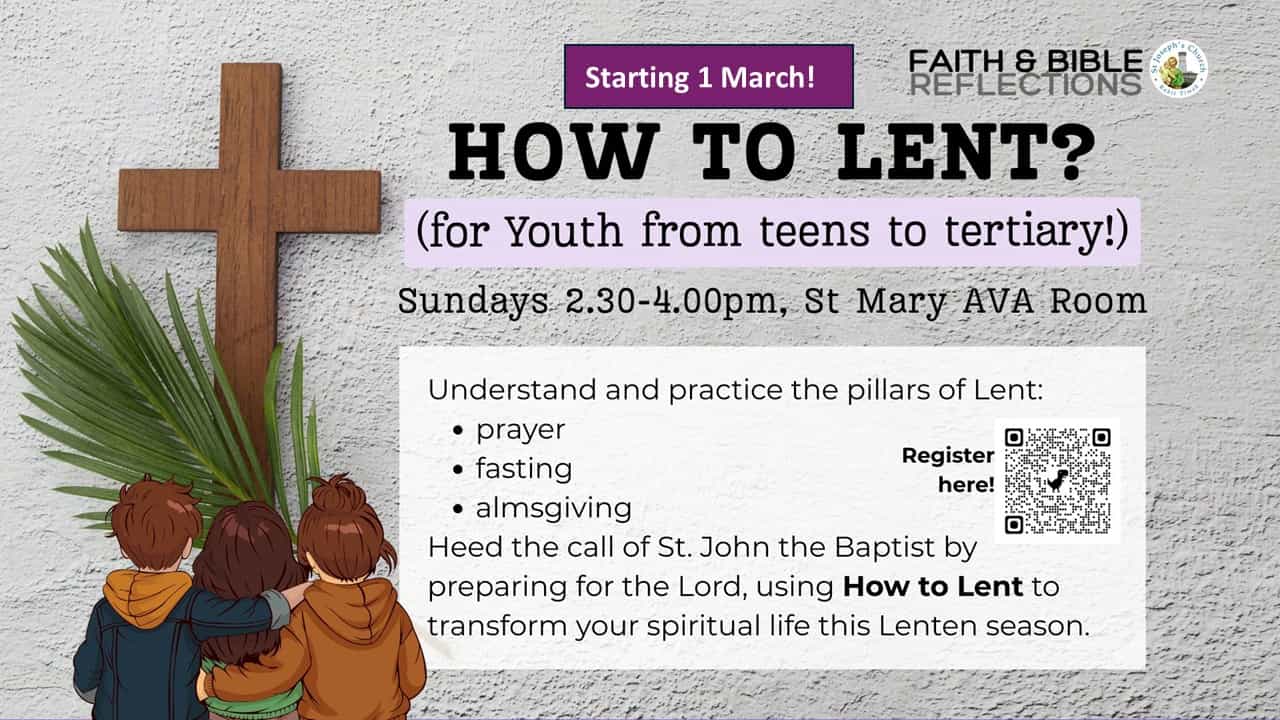 Journey through Lent with the Faith & Bible Reflections Community starting 24 and 25 February! The first session will be in-person, subsequent sessions will be online via zoom. Join in for a time of prayer, scripture reflection, sharing and fellowship: