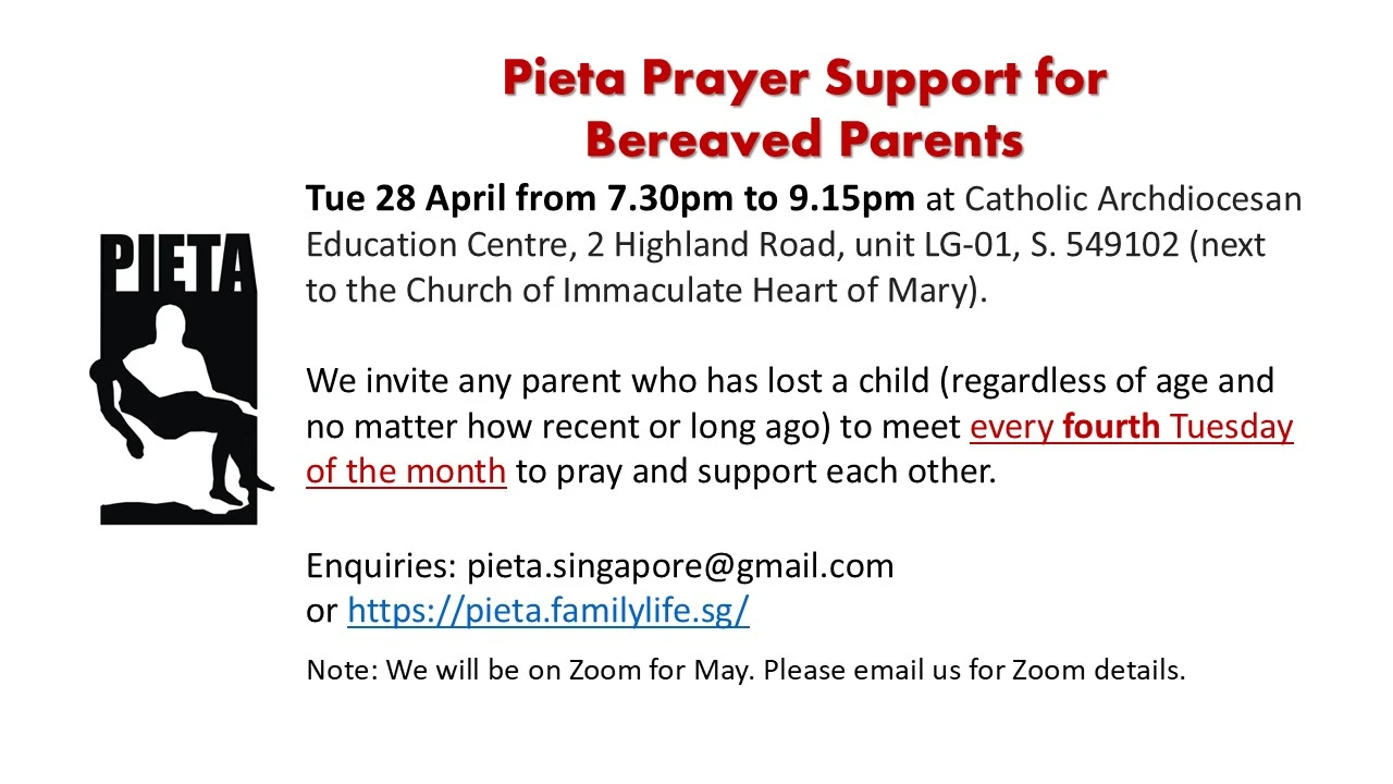 PIETA is a support group for bereaved parents who have united in faith to seek God's comfort, wisdom and hope. The monthly session, run by bereaved parents, is for prayer, reflection and the breaking open of the WORD OF GOD. Any parent who has lost a child (regardless of age and no matter how recent or long ago) is invited to the sessions to journey together in faith.