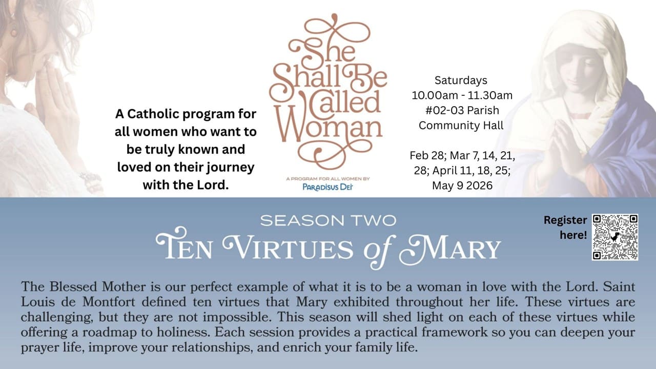 'She Shall be called Woman' (SHE) Women's Fellowship is back with season 2: the 10 Virtues of Mary! Scripture doesn’t say much about Mary, but the little that’s revealed speaks volumes. Here are Marian virtues to imitate to bring you to the fullness of your womanhood. All women 18+ years are welcome!