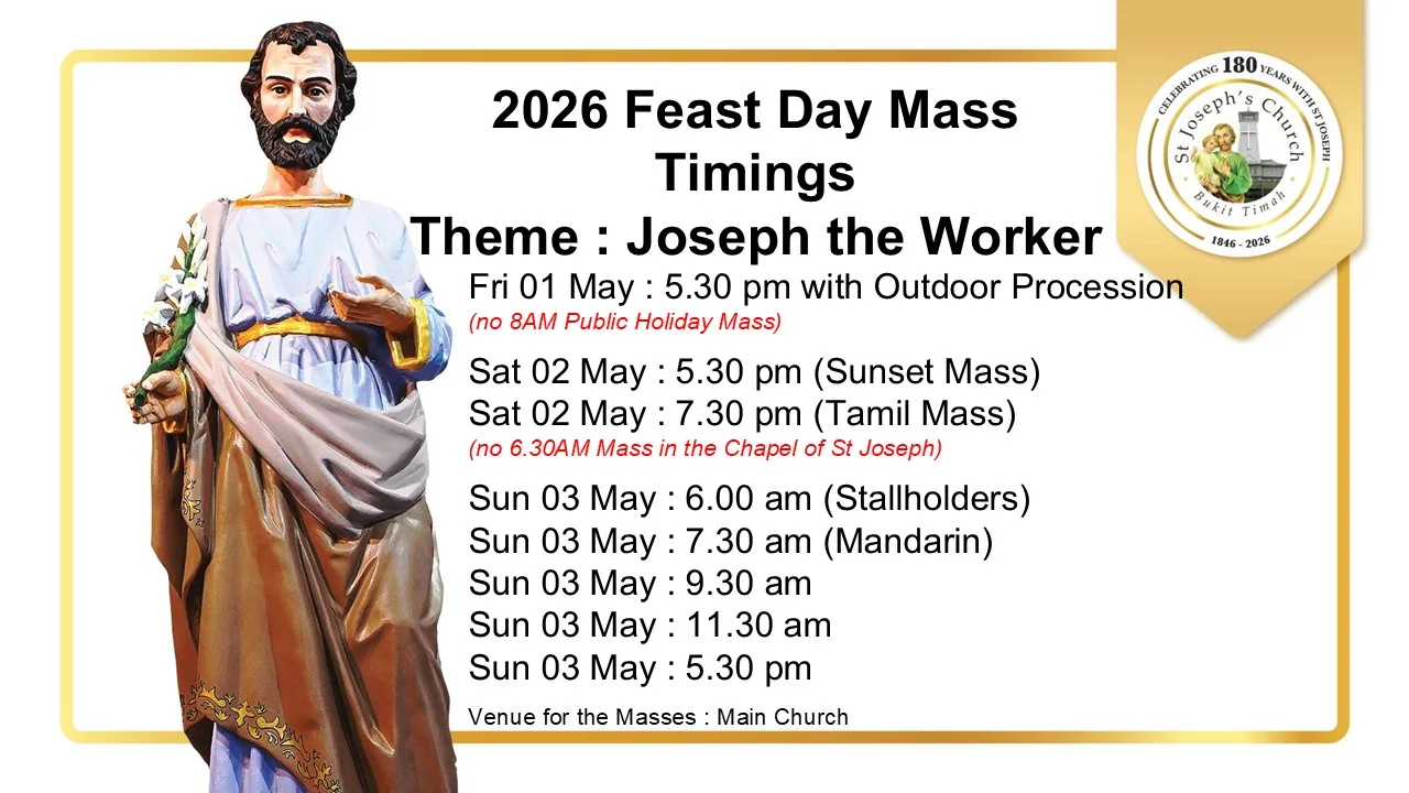 Weekday (Morning): Mon – Sat @ 6.30AM (Chapel of St Joseph)